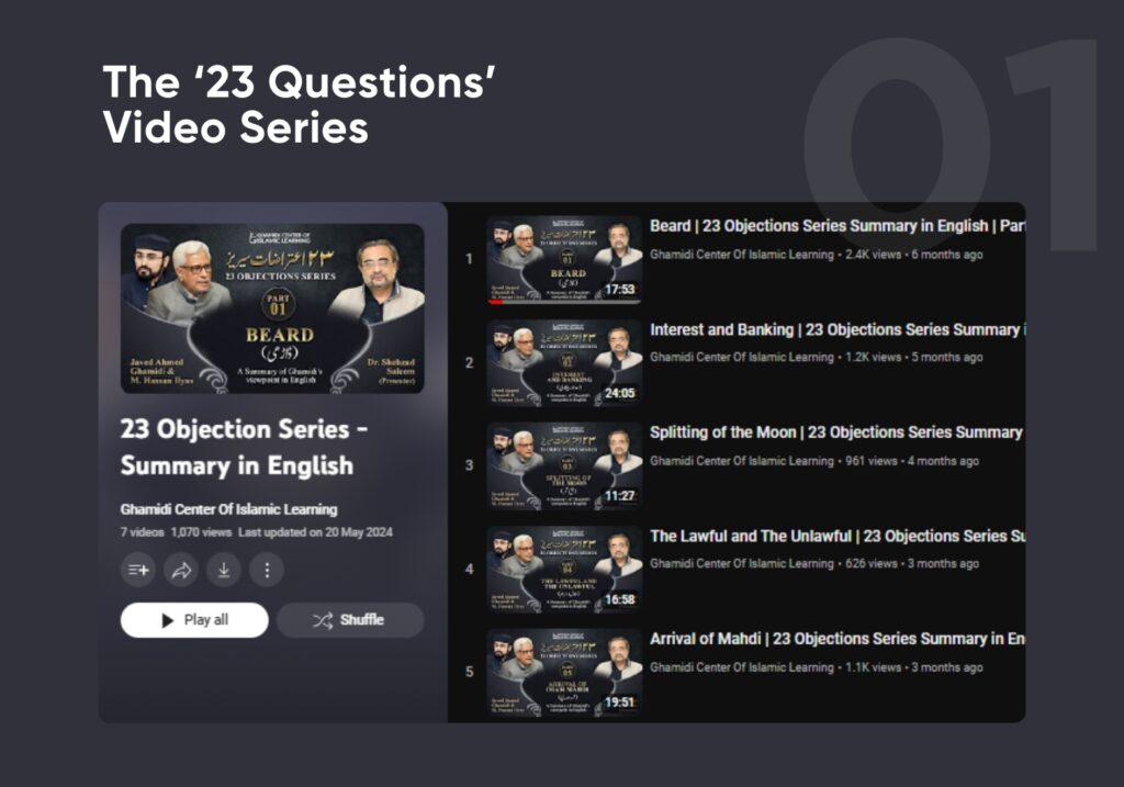 The 23 Questions Series is a comprehensive research-based project dedicated to addressing key objections raised against Javed Ahmed Ghamidi’s approach to Islamic thought. This initiative is designed to provide clear, well-reasoned, and structured responses to some of the most critical debates in Islamic scholarship, ensuring that complex theological and jurisprudential discussions are articulated in a way that is both accessible and intellectually rigorous. The project is rooted in an extensive video research series, where each question is analyzed through a systematic study of the Quran, Sunnah, and historical Islamic scholarship.